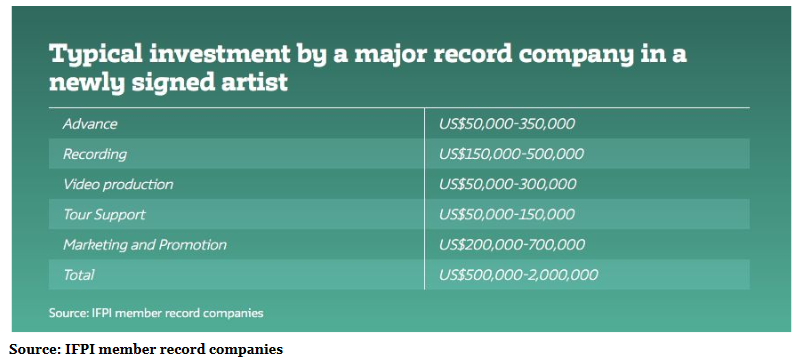 Perusahaan rekaman diperkirakan setiap tahun menginvestasikan $ 4,5 miliar di seluruh dunia untuk pemasaran. Ini mewakili 26% dari pendapatan industri. Biaya pemasaran dan promosi merupakan satu-satunya pengeluaran terbesar untuk perusahaan rekaman pada artis baru. Seniman membayar apapun dari $ 100 dan ke atas untuk mendapatkan promosi