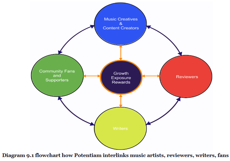 Kreativitas musik masih melalui sistem perantara kuno yang dikembangkan sebelum kemunculan internet, di mana seniman kehilangan hingga 86% hasil dari musik mereka. Potentiam menghubungkan dan menyediakan platform yang stabil untuk interaksi dan kolaborasi. Potentiam memberi penghargaan dan mendorong motivasi untuk sukses dengan menyediakan platform tepercaya yang menghubungkan pengguna yang berbeda dengan tujuan yang sama, dan aspirasi untuk berbagi dan melakukan transaksi.