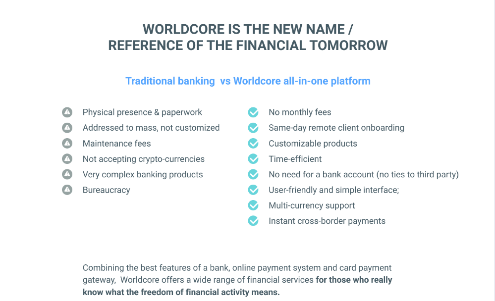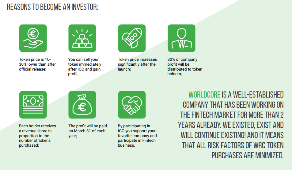 Proyek Worldcore adalah hal baru di pasar mata uang kripto dan di sinilah kami, untuk menggambarkannya lebih dekat kepada Anda. Sebuah proyek baru yang menggunakan teknologi rantai blok state-of-the-art. Penawaran token diumumkan hanya beberapa bulan yang lalu, dan para pendiri Worldcore tidak mengharapkan respon yang begitu besar. Ketika situs mereka diterjemahkan ke dalam 8 bahasa, itu adalah tanda bahwa belasan orang datang dan mencapai kesuksesan besar, luar biasa. Orang-orang mendengar tentang token WRC dan menunjukkan minat yang besar. Setelah 9 minggu, para pendiri Worldcore meluncurkan produk, layanan, dan layanan mereka dan memberi pengguna platform dan kemajuan yang menarik. Selama waktu itu, IIS juga merilis aplikasi seluler untuk pengguna iOS. Para pendiri berada di jantung kota Praha, di mana mereka memiliki kantor mereka, dan beroperasi dan beroperasi selama 3 tahun.